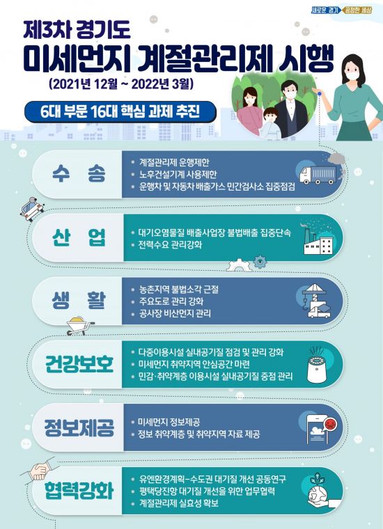 2019년부터 시작된 정부의 미세먼지 계절관리제는 미세먼지농도가 높아지는 12월부터 이듬해 3월까지 4개월간 평상시보다 강력한 감축정책을 추진하는 것을 말한다. 도는 3차 계절관리기간을 맞아 ▲수송 ▲산업 ▲생활 ▲건강보호 ▲정보제공 ▲업무협력 등 6대 부문에서 16개 이행과제를 선정해 추진할 계획이다.