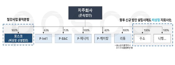 철강 사업회사인 포스코는 물적 분할돼 지주사가 지분을 100% 보유하게 된다. 포스코는 앞으로 신규 설립하는 법인들에 대해 상장하지 않을 방침이다.