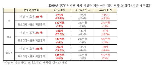 26일 국민의힘 김영식 의원이 IPTV 3사를 통해 입수한 ‘2020년 IPTV 연평균 자체 시청률 기준 채널 현황’ 자료에 따르면 KT는 전체 266개 채널의 83.8%인 223개, SK브로드밴드는 270개 채널의 77.0%인 208개, LG유플러스는 259개 채널의 78.8%인 204개 채널의 연평균 시청률이 0.1%도 나오지 않는 것으로 밝혀졌다.