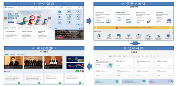 금융소비자·금융업계종사자 등의 이용자에게 맞춤형 정보가 제공되며 첫 화면을 콘텐츠 종류에 따라 ▲보도·알림 ▲금융소비자 ▲업무자료 ▲미디어센터 4개 영역으로 그룹화시켜 배치했다.
