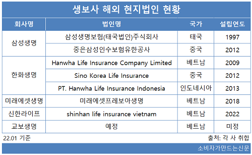 삼성생명의 경우 지난 1997년 태국법인 및 2012년 중국에 중은삼성인수보험유한공사를 설립했다.