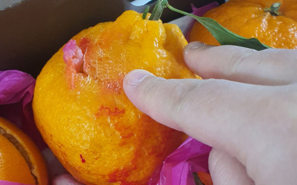 배송된 과일세트를 살펴보니 레드향 2개는 터져 있었고 한라봉 4개는 썩어 있었다. 이뿐 아니라 대부분 과일 껍질에 포장색지의 분홍 염료가 묻어있었다.