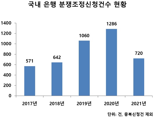 7일 은행연합회에 따르면 지난해 국내 은행에 대한 분쟁조정 신청건은 전년 대비 44% 감소한 720건을 기록했다. 사모펀드 사태 이전이었던 2018년 642건 이후 가장 적은 수치다.