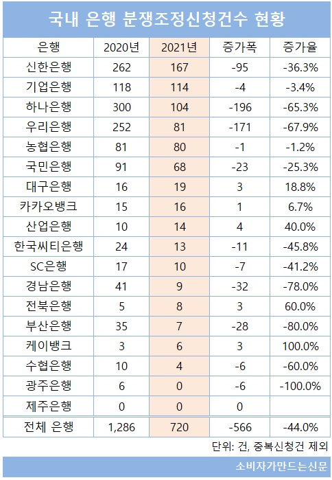 전년 대비 분쟁조정 신청이 가장 많이 감소한 곳은 우리은행과 하나은행이었다.