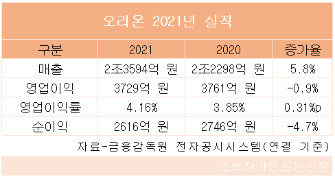 다만 영업이익은 원재료비 급등, 영업체제 전환 비용 증가, 2020년 일시적인 코로나19 정부보조금 혜택에 따른 역기저 효과 등으로 전년 대비 다소 감소했다는 게 오리온 측 설명이다.