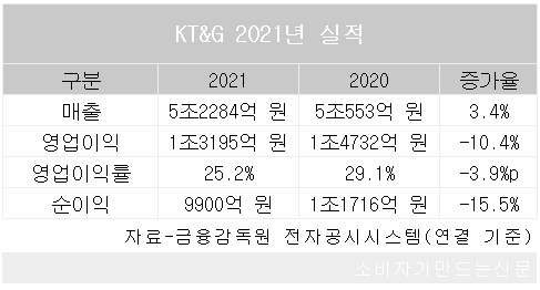 URL복사 기사공유하기 스크랩 프린트 메일보내기 글씨키우기 KT&G는 연결 기준 지난해 연매출 5조2284억 원과 영업이익 1조3195억 원, 순이익 9900억 원의 잠정 실적을 10일 공시했다. 매출은 전년에 비해 3.4% 늘었고 영업이익과 순이익은 각 10.4%, 15.5% 줄었다. 이에 따른 영업이익률은 25.2%로 전년동기에 비해 3.9%포인트 하락했다. KT&G 측은 이익 감소에 대해 "수익성 악화와 영업외손익 변동 영향"이라고 설명했다. [소비자가만드는신문=김경애 기자] 저작권자 © 소비자가 만드는 신문 무단전재 및 재배포 금지 김경애 기자 다른기사 보기 URL복사 기사공유하기 주요기사 르노, ‘필랑트’ 최초 공개...SUV 3형제로 판매량 상승세 잇는다 태광그룹, 코스메틱 전문법인 ‘SIL’ 설립...K-뷰티 신사업 시동 군포시 찾은 김동연 지사, "도내 노후계획도시 정비사업 원활한 추진에 역량 집중" 빙그레, 해태아이스크림 흡수합병..."중복 사업 조직 통합" 강호동 농협중앙회장 대국민 사과, 농민신문사 회장직도 사임 보험사 기본자본 K-ICS 비율 50% 규정...미달 시 경영개선권고·요구 조치