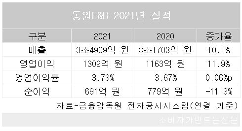 동원F&B는 연결 기준 지난해 연매출 3조4909억 원과 영업이익 1302억 원, 순이익 691억 원의 잠정 실적을 10일 공시했다.