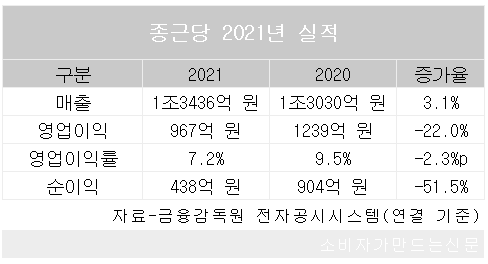 URL복사 기사공유하기 스크랩 프린트 메일보내기 글씨키우기 종근당은 연결 기준 지난해 연매출 1조3436억 원과 영업이익 967억 원, 순이익 438억 원의 잠정 실적을 10일 공시했다. 매출은 전년에 비해 3.1% 늘어난 반면 영업이익은 지난해 호실적에 따른 기저효과로 인해 22.0% 줄었다. 종근당은 지난해 연간 영업이익으로 1239억 원을 올렸는데, 전통 제약사 가운데 1000억 원 이상의 이익을 기록하는 곳은 손에 꼽히는 수준이다. 순이익은 51.5% 줄었고, 영업이익률도 7.2%로 전년동기 대비 2.3%포인트 하락했다. 종근당 측은 "일회성 비용과 연구개발비 증가로 순이익이 감소했다"고 말했다. [소비자가만드는신문=김경애 기자] 저작권자 © 소비자가 만드는 신문 무단전재 및 재배포 금지 김경애 기자 다른기사 보기 URL복사 기사공유하기 주요기사 빙그레, 해태아이스크림 흡수합병..."중복 사업 조직 통합" 강호동 농협중앙회장 대국민 사과, 농민신문사 회장직도 사임 보험사 기본자본 K-ICS 비율 50% 규정...미달 시 경영개선권고·요구 조치 닥사 “가상자산 거래소 대주주 지분 제한 반대한다” GS25, 설 명절 선물세트 700종 출시…프리미엄·가성비 다잡아 LS, 에식스솔루션즈 '쪼개기 상장' 논란 정면 반박…"장기간 보유한 해외 사업 국내 자본시장에 소개"