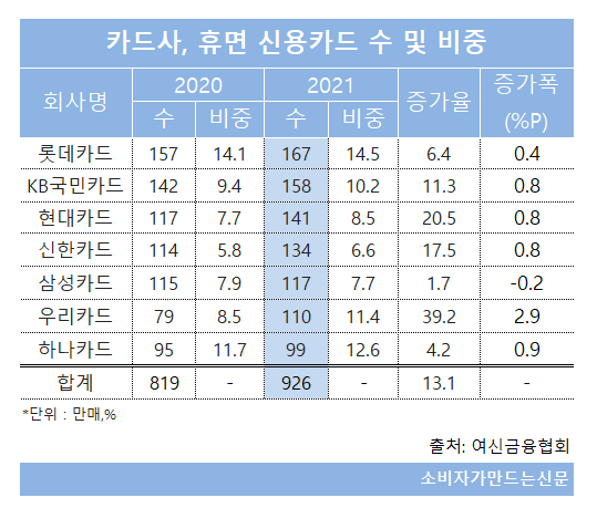 카드사 가운데 휴면카드 수가 가장 많은 곳은 롯데카드로 167만 매에 달했다. 롯데카드는 2019년, 2020년에도 휴면카드 수가 가장 많았다. 휴면 신용카드 비중 역시 롯데카드가 가장 높았다.