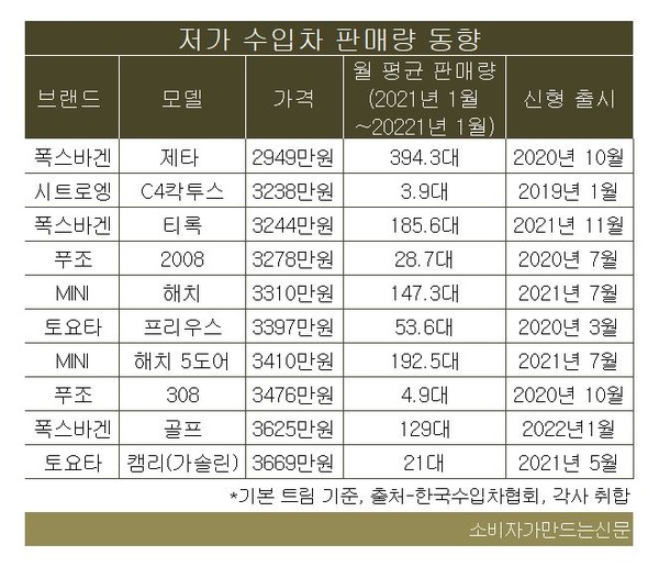 이어 시트로엥 'C4칵투스(3238만 원)'-폭스바겐 '티록(3244만 원)'-푸조 '2008(3278만 원)'-MINI ‘해치 쿠퍼(3310만 원)’-토요타 ‘프리우스(3378만 원)’-MINI ‘해치 쿠퍼 5-도어(3410만 원)’-푸조 ‘308(3476만 원)’-폭스바겐 ‘골프(3625만 원)’-토요타 ‘캠리(3669만 원)’ 순으로 저렴하게 판매 중이다.