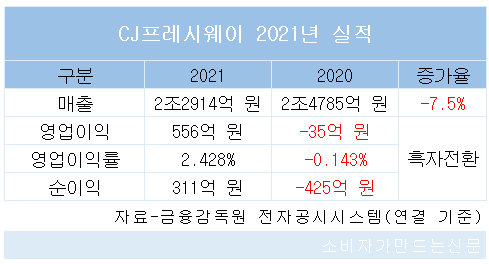 CJ프레시웨이는 연결 기준 지난해 연매출 2조2914억 원과 영업이익 556억 원, 순이익 311억 원의 잠정 실적을 11일 공시했다.