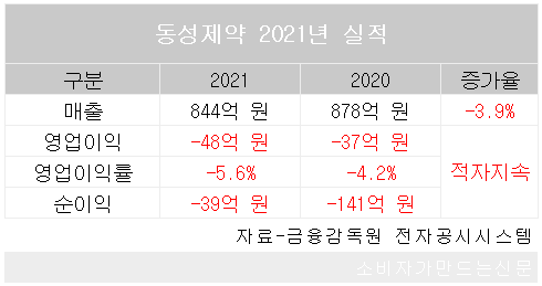 URL복사 기사공유하기 스크랩 프린트 메일보내기 글씨키우기 동성제약은 지난해 연매출 844억 원과 영업이익 -48억 원, 순이익 -39억 원의 잠정 실적을 10일 공시했다. 코로나19 사태가 지속되면서 매출은 전년에 비해 3.9% 줄었고 영업이익과 순이익은 적자를 지속했다. 다만 순이익의 경우 2020년 -141억 원에서 72.3% 증가하며 적자 폭이 줄었다. 동성제약 측은 "당기 금융비용의 감소로 당기순손실 폭이 감소했다"고 말했다. [소비자가만드는신문=김경애 기자] 저작권자 © 소비자가 만드는 신문 무단전재 및 재배포 금지 김경애 기자 다른기사 보기 URL복사 기사공유하기 주요기사 빙그레, 해태아이스크림 흡수합병..."중복 사업 조직 통합" 강호동 농협중앙회장 대국민 사과, 농민신문사 회장직도 사임 보험사 기본자본 K-ICS 비율 50% 규정...미달 시 경영개선권고·요구 조치 닥사 “가상자산 거래소 대주주 지분 제한 반대한다” GS25, 설 명절 선물세트 700종 출시…프리미엄·가성비 다잡아 LS, 에식스솔루션즈 '쪼개기 상장' 논란 정면 반박…"장기간 보유한 해외 사업 국내 자본시장에 소개"