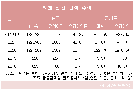 올해 증권가에서 실적 공시일인 17일 이전에 내놓은 추정 실적치의 평균값을 살핀 결과 씨젠의 올해 연매출은 지난해보다 14.5% 감소한 1조1723억 원, 영업이익은 22.8% 줄어든 5149억 원으로 예상됐다.