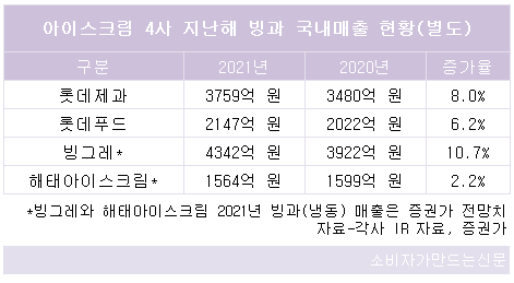 각사 IR자료와 올해 증권가에서 내놓은 추정 실적치를 살핀 결과 빙그레의 지난해 빙과류 예상 매출은 전년에 비해 10.7% 성장한 4342억 원을 기록했다. 롯데제과는 8% 증가한 3759억 원이다. 양사 빙과 매출은 2020년 441억 원에서 지난해 583억 원으로 격차가 더 벌어졌다.