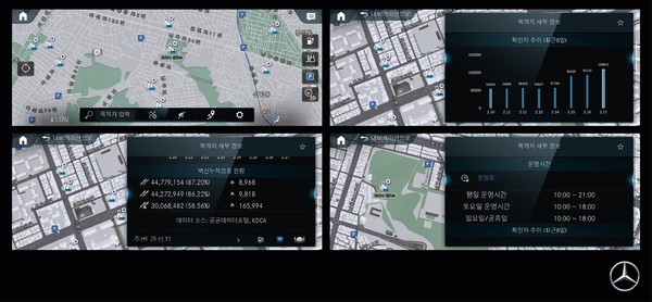 본 위치 표시 기능은 MBUX 내비게이션 지도에서 선별진료소를 비롯해 종합병원, 일반 의원 등 신속항원검사가 가능한 의료기관 정보를 빠르게 알려주고, 의료기관의 사정으로 검사가 여의치 않은 경우 지도에 표시되지 않는 등 보다 정확한 정보가 수시로 업데이트 된다.