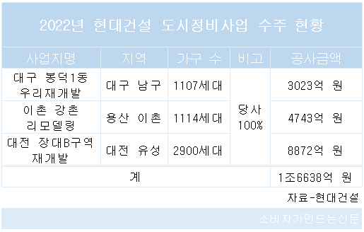 실제 현대건설의 도시정비사업 수주 행진은 올해도 계속될 전망이다. 서울과 수도권의 대규모 리모델링 사업 입찰 참여가 예정돼 있고, 지방 주요 광역시를 중심으로 한 조 단위 메가 프로젝트들도 시공사 선정을 앞두고 있기 때문이다.
