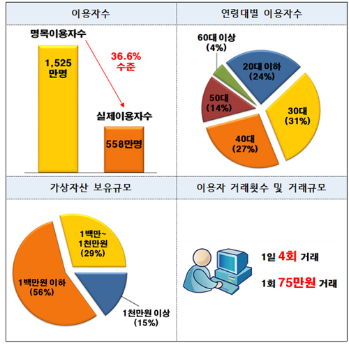 이용자들은 일평균 4회 거래를 시도했고 1회 당 거래금액은 약 75만 원 수준이었다. 가상자산거래 이용자의 절반 이상인 56%가 100만 원 이하 가상자산을 보유했지만 1000만 원 이상 보유자도 82만 명에 달했다.