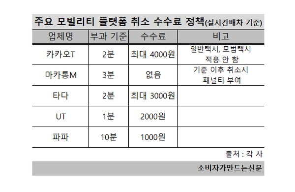 소비자가 만드는 신문 조사 결과 모빌리티 플랫폼사는 배차서비스 취소에 따른 수수료를 자체 규정으로 시행중이다. 수수료 부과 기준은 배차후 최소 1분에서 최대 10분까지로 나타났다. UT가 1분으로 가장 짧고 카카오T와 타다는 2분, 마카롱M은 3분이고, 파파는 10분으로 가장 길었다.