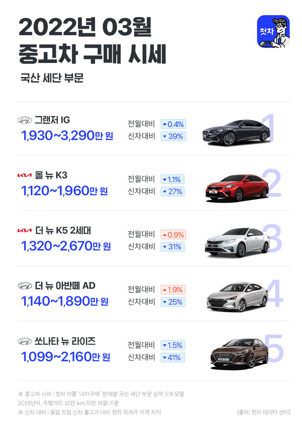 첫차 김윤철 이사는 “중고차 성수기를 앞두고 주요 세단 모델들이 보합세를 보이고 있다. 천정부지로 솟은 신차급 중고차의 시세와 판이한 양상이다. 시세 상승을 우려했던 중고차 소비자들이 예상보다 저렴하게 중고 세단을 구매할 수 있는 적기”라고 설명했다.