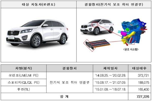 우선 현대차·기아가 제작, 판매한 투싼, 쏘렌토 등 3개 차종 72만7226대는 전기식 보조 히터 연결부의 내열성 부족으로 온도가 과도하게 높아지면 연결부 및 전기배선 손상으로 화재가 발생할 우려가 생겼다.