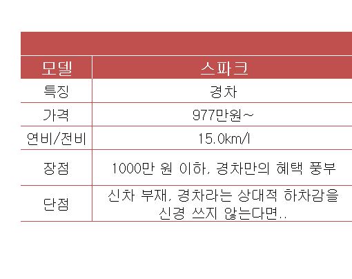◆가격만 본다면 한국지엠 ‘스파크’로 직진