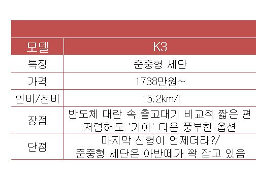 세단, 특히 준중형 세단 최저가 모델은 현대자동차 ‘아반떼’가 그동안 1위였지만 현 시점에선 기아 ‘K3’가 1738만 원(트렌디 트림)으로 가장 저렴하다. 최근 차량용 반도체 수급난으로 현기차 라인업 출고가 길어지고 있는데 K3는 전 사양이 3개월이면 출고 가능이다.