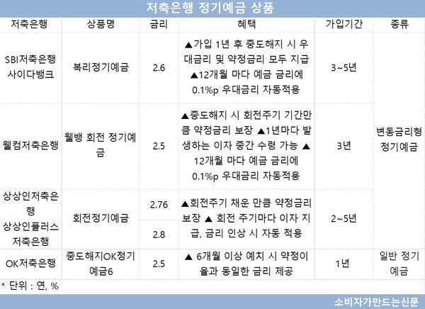 SBI저축은행 사이다뱅크의 경우 최근 금리 연 2.6%(이하 세전)의 변동금리형 정기예금 '복리정기예금'을 선보였다.