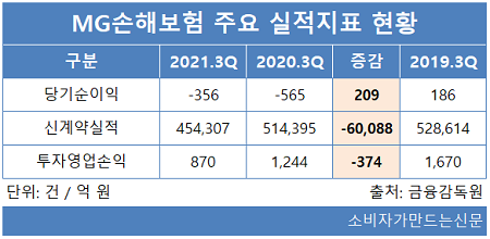 MG손보의 문제는 RBC비율에만 국한되지 않는다. 당기순손실과 신계약실적 저하, 투자영업손익의 감소 등 경영지표가 전반적으로 악화돼 영업활동을 통해서 건전성을 개선하기 어려운 구조에 놓여 있다. 지난해 3분기 MG손보의 당기순손실은 356억 원으로 전년 동기 565억 원에 비해서는 200억 원 이상 개선됐지만, 2년째 큰 폭의 적자를 내고 있어 자력으로 RBC를 개선하기는 어려운 상황이다.