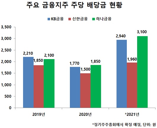 다만 하나금융은 업계 최초로 중간배당을 실시해왔고 2021년 회계연도에서도 1주 당 배당금이 보통주 기준 3100원으로 경쟁사보다 높게 형성되는 등 과거부터 활발하고 일관된 배당정책으로 주주들과 소통하고 있다는 점은 긍정적이다.
