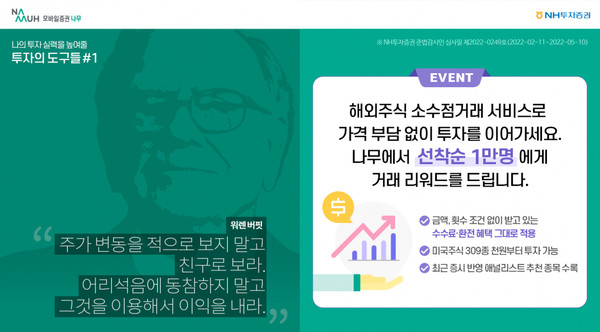 장정임 NH투자증권 나무 기획부장은 “최근 미국 증시가 조정을 보이며 분할매수를 고려하는 고객들을 위해 가격 부담 없이 활용 가능한 서비스를 소개하고자 이번 이벤트를 기획하게 됐다”며 “앞으로도 시장 상황에 알맞은 혜택과 서비스를 제공할 계획”이라고 말했다.