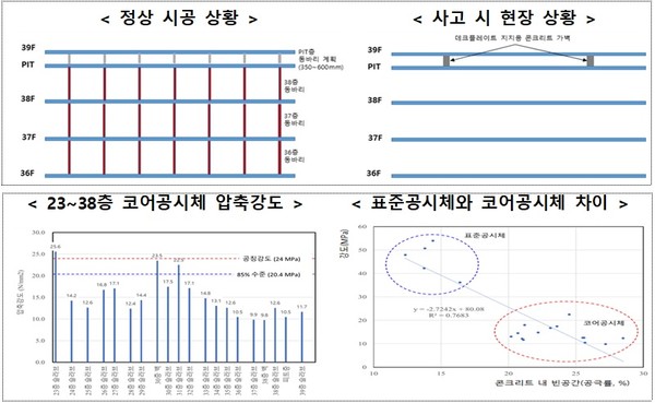 붕괴 건축물에서 채취한 콘크리트 시험체의 강도시험 결과, 대다수 시험체가 설계기준강도의 85% 수준에 미달(17개층 중 15개층)했다.