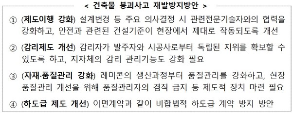 사조위는 사고원인 분석 결과에 따라 제도이행 강화, 현감리제도 개선, 자재·품질관리 개선, 하도급 제도 개선 등의 재발방지방안을 제시했다.