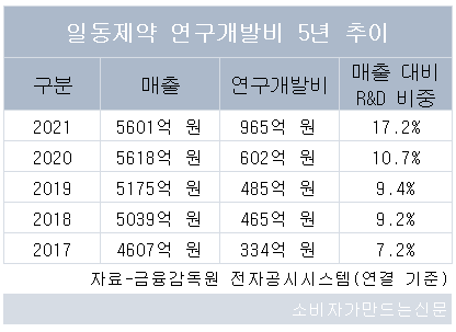 일동제약의 최근 5년간 R&D 투자 규모를 경상연구개발비로 살펴보면 2017년 7.2%(매출 4607억 원, 연구개발비 334억 원)에서 2018년 9.2%(매출 5039억 원, 연구개발비 465억 원), 2019년 9.4%(매출 5175억 원, 연구개발비 485억 원), 2020년 10.7%(매출 5618억 원, 연구개발비 602억 원), 2021년 17.2%(매출 5601억 원, 연구개발비 965억 원)로 꾸준히 상승해왔다.