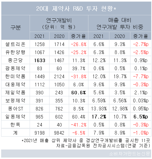지난해 연구개발비 규모가 가장 큰 곳은 종근당으로, 전년에 비해 11.3% 늘어난 1633억 원을 기록했다. 제일약품과 일동제약은 연구개발비 증가율이 60%를 넘겼고, 매출 대비 R&D 비중은 일동제약이 17.2%로 가장 높았다.