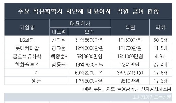 LG화학(대표 신학철)이 30.9배로 격차가 가장 컸고, 한화솔루션(대표 김동관)이 27.4배로 뒤를 이었다. 롯데케미칼(대표 김교현)과 금호석유화학(대표 백종훈)은 각각 11.5배, 4.9배로 연봉 격차가 상대적으로 낮았다.