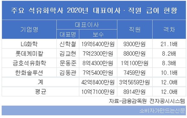 2020년에도 석유화학사 중 CEO와 직원간 연봉 격차가 가장 큰 곳도 LG화학이었다. 당시 신학철 대표는 19억6400만 원을 보수로 받았고 직원 1인당 평균 급여는 9300만 원이었다. 격차는 21.1배였다. 지난해 그 격차가 더 벌어졌다.
