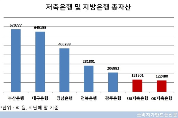 다만 SBI저축은행과 OK저축은행의 총자산은 아직 지방은행을 위협하기 어려운 수준이다.