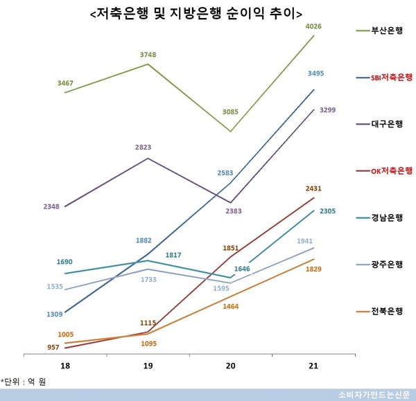 OK저축은행도 2018년 957억 원에 불과했던 순이익이 2019년 1115억 원, 2020년 1851억 원으로 빠르게 늘었고, 지난해엔 31%나 증가했다. OK저축은행은 2019년 전북은행, 2020년 경남은행과 광주은행을 차례로 앞섰다.