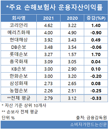 4일 생명보험협회에 따르면 전체 손해보험사 33곳의 평균 운용자산이익률은 2.79%로 전년 동기 3.12%대비 0.33%포인트 하락했다.