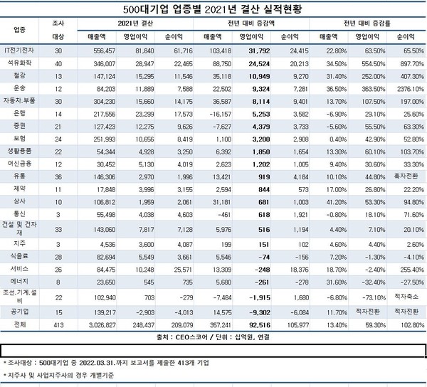 업종별로 보면, 21개 업종 중 매출이 증가한 업종은 17곳(81%)이었다. IT전기전자는 매출이 2020년 453조395억 원에서 지난해 556조4570억 원으로 103조4175억 원(22.8%) 늘며 증가액이 가장 컸다.