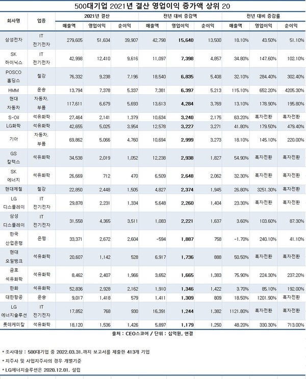 3일 기업데이터연구소 CEO스코어(대표 김경준)가 국내 500대 기업 중 지난달 31일까지 보고서를 제출한 413개 기업의 2019~2021년 실적변화를 조사한 결과, 지난해 500대 기업 매출은 3026조8266억 원으로 전년 2669조5853억 원에 비해 357조2413억 원(13.4%) 증가했다.