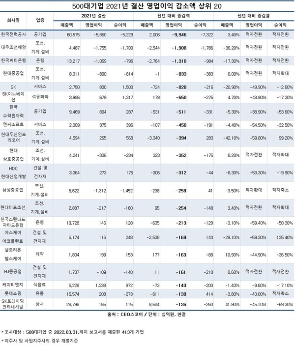 반면 공기업(-9조3019억 원·적자전환) △조선·기계·설비(-1조9146억 원·73.1%↓) △에너지(-2610억 원·32.4%↓) △서비스(-2476억 원·2.4%↓) △식음료(-740억 원·1.3%↓) 업종은 영업이익이 줄었다.
