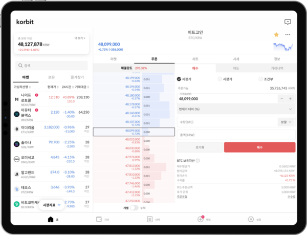 또한 넓은 환경에서 편리하게 거래할 수 있도록 사용자 인터페이스·사용자 경험(UI·UX)를 아이패드에 최적화했다. 코빗은 올해 상반기 안에 안드로이드 기반 태블릿도 지원할 예정이라고 밝혔다.