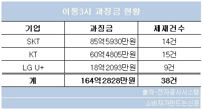 금융감독원 전자공시시스템에 따르면 지난해 이통3사가 지급한 과징금·과태료는 총 164억2828만 원이다.