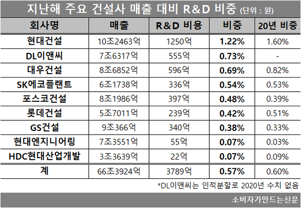5일 금융감독원 전자공시시스템에 따르면 10대 건설사 중 관련 수치를 공개한 9개사의 지난해 매출은 총 66조3924억 원, 연구개발 비용은 3789억 원으로 매출과 비교한 연구개발 투자비중 0.57%로 집계됐다. 2020년에는 인적분할로 관련 데이터가 없는 DL이엔씨를 제외한 8개사의 연구개발투자 비중이 0.6%였던 것에 비하면 약간 하락한 수치다.