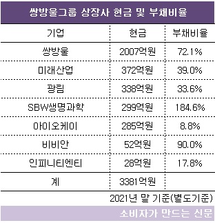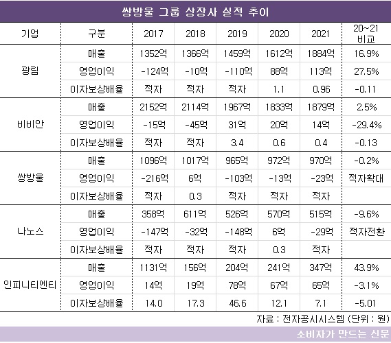 게다가 그룹 대표기업인 쌍방울은 2013년부터 지난해까지 9년 연속 이자보상배율이 1미만이거나 영업적자를 기록 중이다.