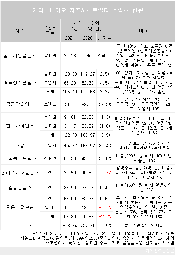 이번 집계에서는 지주사 체제 제약·바이오사 12곳 중 로열티 수익을 별도 공개하지 않은 제일파마홀딩스(대표 한상철)와 JW홀딩스(각자대표 이경하·한성권), 감사보고서 제출 전인 송암사(대표 장원준) 3곳이 제외됐다.