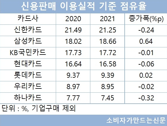 기업구매 실적을 제외한 신판 점유율 1위는 신한카드로 전년 대비 0.24%포인트 하락한 21.25%를 기록했다.