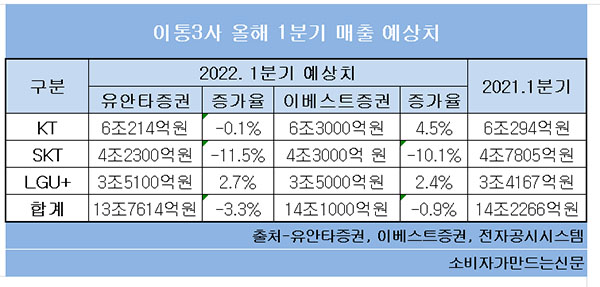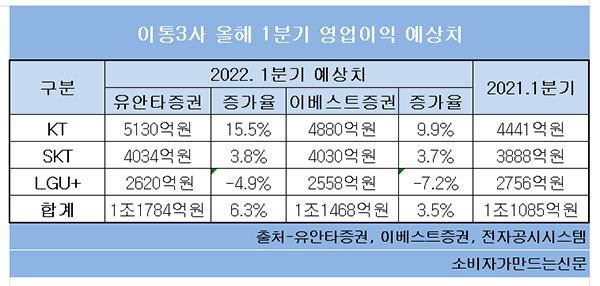 이통3사의 올해 1분기 예상 영업이익이 엇갈릴 전망이다. SK텔레콤(대표 유영상)과 KT(대표 구현모)는 플러스 성장하지만 LG유플러스(대표 황현식)는 감소할 것으로 분석됐다.