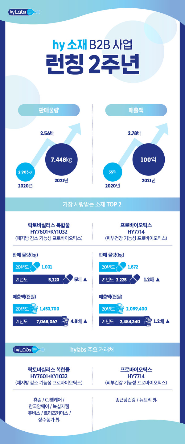 김민수 hy연구기획팀장은 "소재 B2B는 자사 핵심역량 기반 신사업으로 CJ웰케어, 종근당건강, 한국암웨이 등 유수 기업과 거래하고 있다. 80여 명의 전문 연구인력이 신소재 발굴을 위해 노력하는 만큼 성장 가능성이 높다"고 말했다.